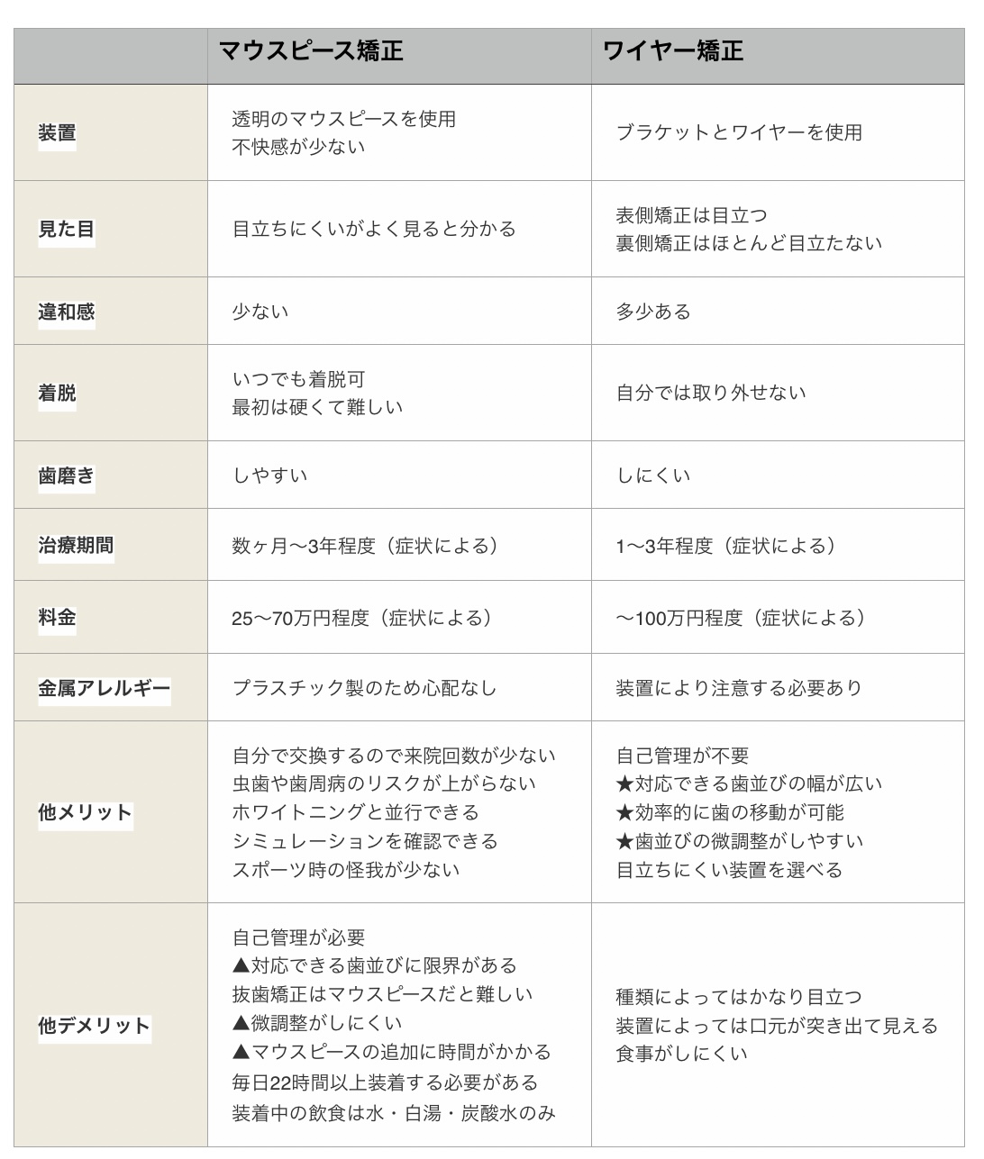 【ワイヤー矯正とマウスピース矯正の比較】