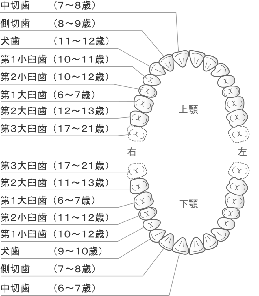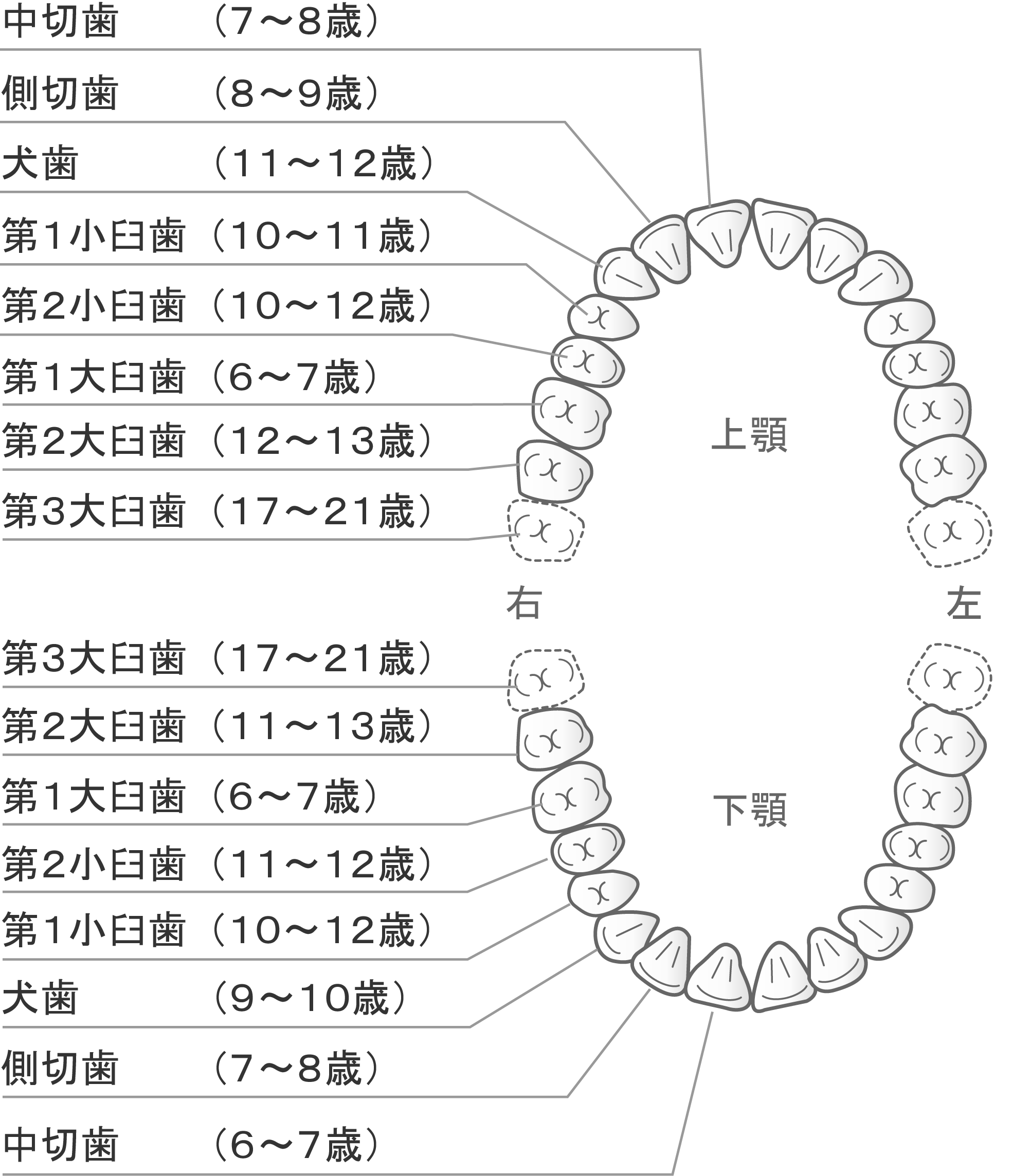 永久歯(親知らず以外)が全て生え揃うのは12〜13歳ごろなので中学1年生の終わりまでに生え揃います。