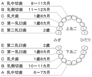 画像の通り平均的な歯の生え始めの時期は個人差があります。